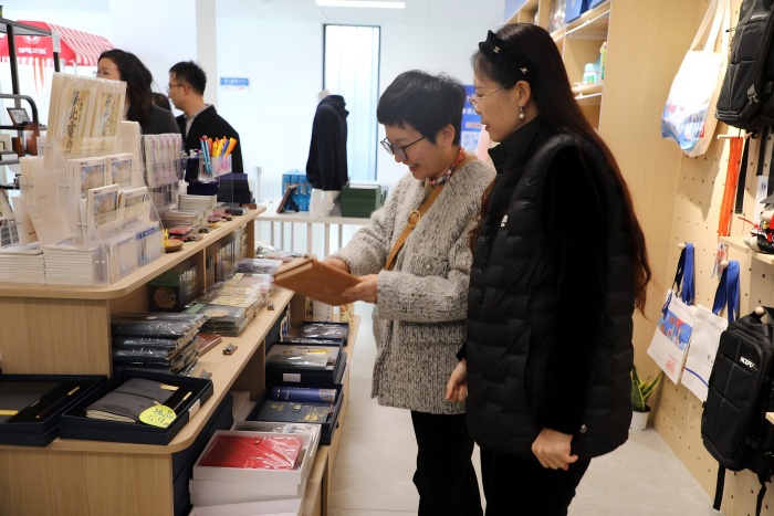 交流结束后,戚金波一行实地参观了华北电力大学文创店,近距离了解学校文化创意产品的开发理念、设计思路与运营模式。店内陈列的融合华电特色与校园文化元素的系列文创产品,既展现了华北电力大学深厚的文化底蕴,也彰显了学校在品牌文化传播方面的创新活力,为两校进一步探索校友文化共建、品牌联合传播等领域的合作提供了新思路。